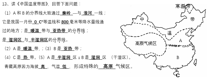 1.我國氣候的基本特征:①(大陸性)季風(fēng)氣候顯著;②氣候復(fù)雜多樣。