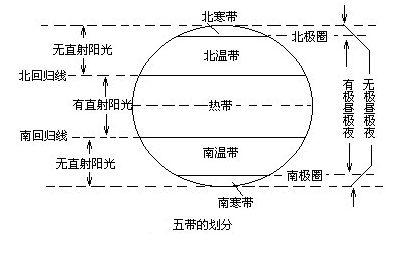 南寒帶、北寒帶--終年寒冷,有極晝極夜現(xiàn)象發(fā)生。