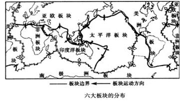 (1)全球由六大板塊構(gòu)成:亞歐板塊、非洲板塊、美洲板塊、太平洋板塊、印度洋板塊、南極洲板塊。其中太平洋板塊幾乎全部由海洋構(gòu)成。