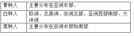 6、根據(jù)人類體質(zhì)方面的特征(膚色、顏色、頭發(fā)、頭型、臉型)等,將人種劃分為白色人種、黃色人種、黑色人種。