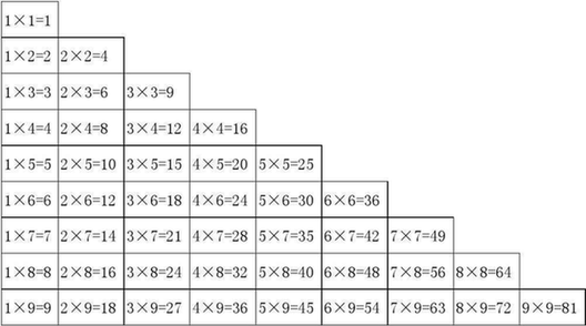 一九得九 二九十八 三九二十七 四九三十六 五九四十五 六九五十四 七九六十三 八九七十二 九九八十一