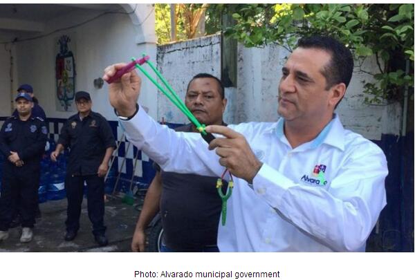 Bogar Ruiz Rosas, the mayor of Alvarado, protested the decision to have his local police force disarmed by organizing a symbolic handover event where he issued police their new sidearms ? slingshots and rocks. During this event, Rosas argued that most of those officers who failed their control tests did so because the department is currently made up of mostly newly recruited officers.