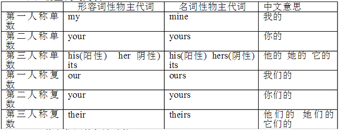 (1)表示所有關(guān)系的代詞叫物主代詞。物主代詞分為形容詞性物主代詞和名詞性物主代詞兩種。物主代詞有人稱和數(shù)的變化。第三人稱單數(shù)的物主代詞還有性的變化。