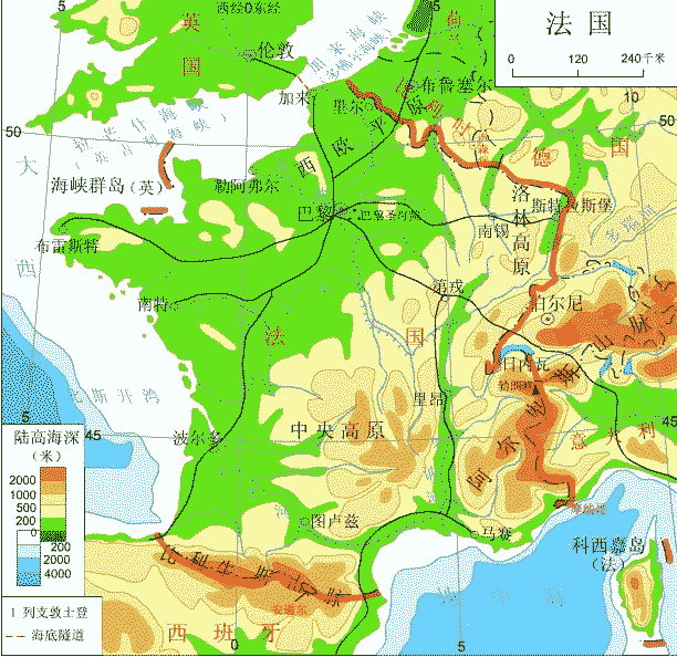 1.法國地勢東南高西北低。平原占總面積的三分之二。主要山脈有阿爾卑斯山脈、比利牛斯山脈、汝拉山脈等。法意邊境的勃朗峰海拔4810米,為歐洲最高峰。