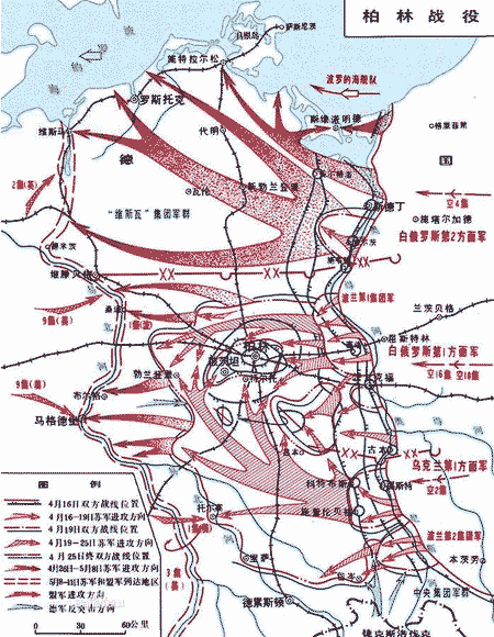 1945年春,蘇軍以3個方面軍250萬人的兵力進(jìn)入德境。德軍調(diào)集軍隊約100萬人死守柏林,集中力量對付蘇軍。蘇軍在對柏林的強(qiáng)攻中采取多路向中心突擊,經(jīng)激烈巷戰(zhàn),于4月27日突入柏林中心區(qū),29日開始強(qiáng)攻國會大廈。30日希特勒在總理府地下室自殺。5月2日柏林衛(wèi)戍司令率部投降。8日德軍統(tǒng)帥部代表在柏林向蘇軍和盟國遠(yuǎn)征軍無條件投降書。法西斯德國就此滅亡。