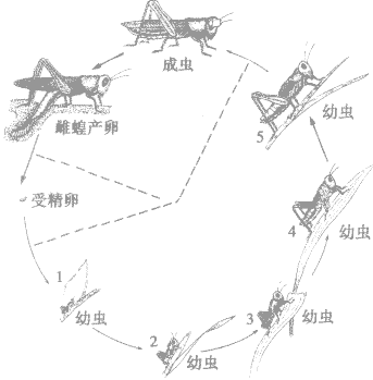 特別提醒:昆蟲的體表有外骨骼,可以有效防止體內(nèi)水分散失,保護和支持內(nèi)部柔軟器官。但外骨骼不能隨身體的生長而長大,所以昆蟲發(fā)育過程中要出現(xiàn)蛻皮現(xiàn)象。蝗蟲的一生要經(jīng)過5次蛻皮,每蛻皮一次增加一齡,幼蟲經(jīng)過5次蛻皮,逐漸長大。最后變成成蟲。