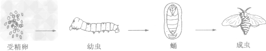 蜜蜂、家蠶等昆蟲的發(fā)育要經(jīng)過受精卵、幼蟲、蛹、成蟲4個時期,而且幼蟲和成蟲在形態(tài)結(jié)構(gòu)和生活習(xí)性上有明顯的差異,這樣的發(fā)育過程叫完全變態(tài)。下圖為家蠶的完全變態(tài)發(fā)育過程。