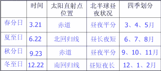 四季變化與太陽的直射點位置: