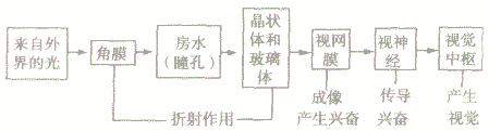視覺(jué)的形成過(guò)程大致是:外界物體反射來(lái)的光線,依次經(jīng)過(guò)角膜、瞳孔、晶狀體和玻璃體,并經(jīng)過(guò)晶狀體等的折射,最終落在視網(wǎng)膜上,形成一個(gè)物像。視網(wǎng)膜上有對(duì)光線敏感的細(xì)胞。這些細(xì)胞將圖像信息通過(guò)視神經(jīng)傳給大腦的一定區(qū)域,人就產(chǎn)生了視覺(jué)。視覺(jué)的形成過(guò)程可表示為圖