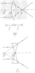 | 焦點 | 凸透鏡能使跟主光軸平行的光線會聚在主光軸上的一點,這一點叫凸透鏡的焦點,如下圖甲所示。凹透鏡能使跟主光軸平行的光線通過凹透鏡后變得發(fā)散,且這些發(fā)散光線的反向延長線相交在主光軸上一點,這一點不是實際光線的會聚點,所以叫凹透鏡的虛焦點,如下圖乙所示![]() | 凸透鏡兩側各有一焦點,且對稱,用字母“F”表示 |