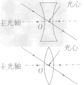 | 透鏡 | 透鏡是利用光的折射來工作的光學元件,它是由透明物質(如玻璃、塑料、水晶等)制成的,表面是球面的一部分。如下圖甲所示,中間厚、邊緣薄的透鏡叫凸透鏡;如下圖乙所示,邊緣厚、中問薄的透鏡叫凹透鏡![]() | 按其厚薄的形狀可分為兩類:凸透鏡和凹透鏡 |