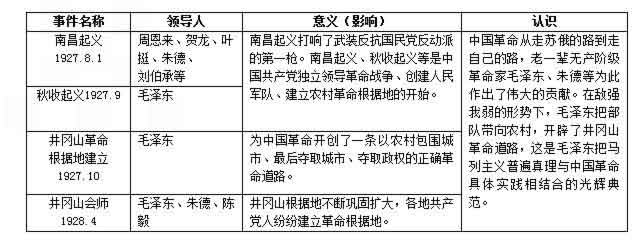 大革命失敗后,共產(chǎn)黨人開始意識到掌握武裝對于中國革命的重要性。經(jīng)歷了南昌起義,秋收起義的失敗后,中國共產(chǎn)黨認識到,必須放棄攻打大城市,走中國自己的革命道路。在文家市決策中決定走農(nóng)村包圍城市的道路,在三灣改編中確立了黨對軍隊的絕對領(lǐng)導(dǎo)權(quán)。1927年秋建立井岡山革命根據(jù)地,1928年勝利會師。