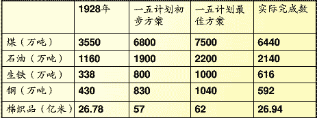 蘇聯(lián)第一個(gè)五年計(jì)劃幾項(xiàng)重要的指標(biāo)完成情況: