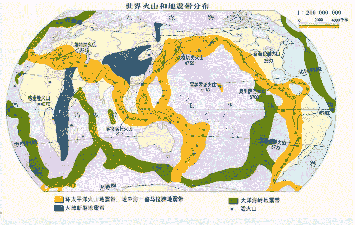 全球有環(huán)太平洋地震帶和地中海?喜馬拉雅山地震帶兩大地震帶,前者約集中了全世界80%以上的淺源地震(0~70千米)、幾乎全部的中源(70~300千米)和深源(300~700千米)地震。它圍繞著太平洋分布,從南美洲的南端開(kāi)始,沿西海岸向北延伸,到北美洲阿拉斯加,折向西經(jīng)阿留申群島、堪察加半島、千島群島到日本。