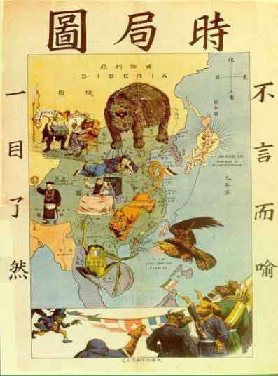 《時(shí)局圖》是根據(jù)興中會(huì)會(huì)員謝贊泰1898年發(fā)表在香港報(bào)紙上的漫畫改繪的。圖中熊代表沙皇俄國,犬代表英國,青蛙代表法國,鷹代表美國,太陽代表日本,腸代表德國。