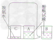 | 在盛有約40ml 蒸餾水的燒杯中加 如5一6滴酚酞試液,攪拌均勻, 觀察現(xiàn)象 | 取步驟I得到的溶液,置于 試管中,再向其中滴加濃 氨水,觀察現(xiàn)象 | 將燒杯中的溶液分別倒入 A、B兩個小燒杯中,另取 一個小燒杯C,加入約5ml 濃 氨水。用一個大燒杯罩住 A,C兩個小燒杯,燒杯B 置于大燒杯外 | |