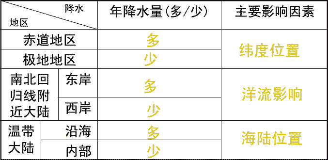 2.受海陸位置因素的影響,大陸內(nèi)部降水少,沿海地區(qū)降水多;