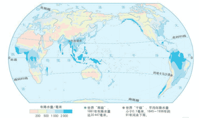 世界的雨極是乞拉朋齊,位于亞洲的印度。世界的干極是阿塔卡馬沙漠,位于南美洲。