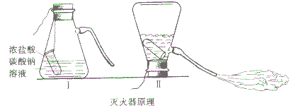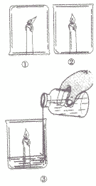 點(diǎn)燃三支蠟燭,在其中一支蠟燭上扣一只燒杯.將另兩支蠟燭放在燒杯中,然后向其中只燒杯中加適量碳酸鈉和稀鹽酸如下圖:![]() | ①在倒扣燒杯中的蠟燭熄滅 ②正放在燒杯中的蠟燭正常燃燒 ③加入適量碳酸鈉和稀鹽酸的燒杯中的蠟燭很快熄滅 | ①在倒扣燒杯中的蠟燭因鈕氣不足而熄滅 ②正放存燒杯中的蠟燭與氧氣接觸,溫度保持在蠟燭的著火點(diǎn)以上,因此能正常燃燒 ⑧稀鹽酸與碳酸鈉迅速反應(yīng)產(chǎn)生大量的二氧化碳?xì)怏w,二氧化碳既不燃燒也不支持燃燒,所以蠟燭很快熄滅。 |