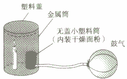 下面是模擬粉塵爆炸的一個實驗:如下圖所示,在無蓋小塑料筒里放入干燥面粉,點燃蠟燭,用塑料蓋蓋住金屬筒,迅速鼓入大量空氣,不久,便會聽到“砰”的一聲,爆炸的氣浪將金屬筒的塑料蓋掀起。
