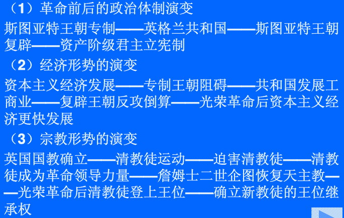 (3)封建王朝的復(fù)辟:1660年詹姆士二世復(fù)辟,1688年“光榮革命”,由于資產(chǎn)階級和新貴族不滿國王專制統(tǒng)治,發(fā)動了宮廷政變。國王的女兒瑪麗和女婿威廉共同執(zhí)政。