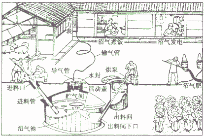 把秸稈、雜草、人類糞便等廢棄物放在密閉的沼氣池中發(fā)酵,就可以產(chǎn)生甲烷。如圖: