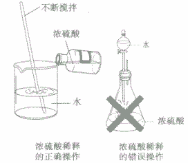 稀釋濃硫酸時(shí),一定要將濃硫酸沿著器壁慢慢地注入水里,并不斷攪拌,使產(chǎn)生的熱量迅速地?cái)U(kuò)散,切不可把水倒入濃硫酸中,因?yàn)樗拿芏容^小,浮在濃硫酸上面,溶解時(shí)放出的熱會(huì)使水立刻沸騰。使硫酸液滴向四周飛濺,這是非常危險(xiǎn)的(如下圖)。若不慎將濃硫酸沾到皮膚上,應(yīng)立即用大量水沖洗,然后涂上3%一5%的 NaHCO3溶液。