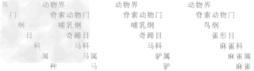 由此可見,馬與驢同科不同屬,共同特征多;馬與麻雀同門不同綱,共同特征少。