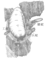 例如,白蟻群體成員之間有明顯的分工,群體中有雌蟻、雄蟻、工蟻和兵蟻。工蟻的職能是筑巢,喂養(yǎng)雌蟻、雄蟻和兵蟻。兵蟻則專司蟻穴的保衛(wèi)。雌蟻是專職的“產(chǎn)卵機(jī)器”,也叫后蟻,有時(shí)它的腹部膨脹得很大,與身體其他部分很不相稱,而且自己不能移動(dòng),由工蟻負(fù)責(zé)移開(kāi)雌蟻產(chǎn)下的卵并加以照料。