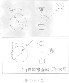 卡爾·洪·佛烈希教授是世界著名的生物學(xué)家和養(yǎng)蜂人。他發(fā)現(xiàn)當(dāng)蜜源距離蜂巢很近時(shí),第一只采食蜂發(fā)現(xiàn)蜜源飛回蜂箱后,要做的第一件事就是把大部分糖漿交給別的蜜蜂,然后跳起佛烈希教授稱之為“圓形舞” 的舞蹈。它在一個(gè)地方轉(zhuǎn)圓圈,一次向左轉(zhuǎn),即逆時(shí)針?lè)较?見(jiàn)圖1—20—11中的實(shí)線部分),一次向右轉(zhuǎn),即順時(shí)針?lè)较?見(jiàn)圖l一2011中的虛線部分),并且是十分用力地重復(fù)許多次。約半分鐘后換到另外的地方,繼續(xù)跳這個(gè) “圓形舞”,最后它總是要回到蜜源處再去吸糖漿。當(dāng)采食蜂跳舞的時(shí)候,靠近它的蜜蜂變得極為興奮。它轉(zhuǎn)圓圈時(shí),有成群的蜂跟在后面,并把觸角伸近它的身體。忽然間其中一只蜂轉(zhuǎn)身離開(kāi)蜂箱,其他蜜蜂也一只跟一只地轉(zhuǎn)身飛離蜂箱,奔向蜜源。這些蜜蜂吸了糖漿返回蜂箱后,也跳起“圓形舞”。這樣一來(lái),在蜂箱內(nèi)跳舞的蜜蜂愈多,出現(xiàn)在蜜源處的蜜蜂也就愈多。很顯然,蜜蜂在蜂箱里的舞蹈是報(bào)告在什么地方有食物存在。