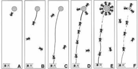 (4)螞蟻在紙片圍成的圓形上或者到處亂走,或者沿著紙片不停地轉(zhuǎn)圈,只有少數(shù)螞蟻發(fā)現(xiàn)了食物。說(shuō)明偵察蟻剛才在小紙片上留下了痕跡,現(xiàn)在這些痕跡的順序改變后,螞蟻就找不到食物了,而這些痕跡就是螞蟻的氣味。