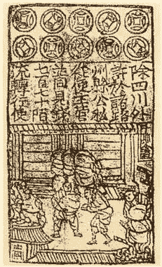 宋真宗時(shí)期,在政府的許可下,成都16家富戶主持印造了一種紙幣,代替鐵錢在四川市場(chǎng)上流通,叫做“交子”。這是世界上最早的紙幣。仁宗時(shí),交子收歸官辦,設(shè)立本錢,定限額發(fā)行,仍在四川使用。徽宗時(shí),改交子名稱為“錢引”,而且不備本錢,取代了早期紙幣交子。