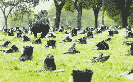 伊拉克戰(zhàn)爭中陣亡的美國士兵的靴子組成的墓地: