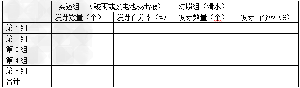 4.每天要給種子澆水,但實驗組一定要用酸雨澆,對照組用清水澆。大約5~7天后,統(tǒng)計各容器中種子的萌發(fā)數(shù),再計算發(fā)芽率。
