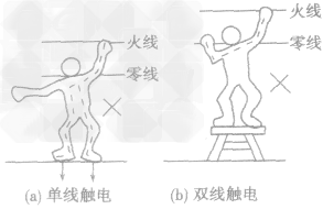 1.低壓觸電:通常所講的“觸電”是指一定大小的電流通過人體所引起的傷害事故。觸電一般分為單線觸電和雙線觸電,如下圖所示。單線觸電是人體直接觸摸電源、火線或漏電的用電器等,使人體與大地形成回路。雙線觸電是人體的兩部分(如兩只手)分別接觸到火線和零線,使人與電網(wǎng)形成回路。