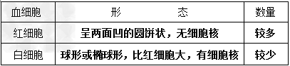 | 形態(tài)結構 | 個體小,呈兩面凹的圓餅狀,成熟的紅細胞無細胞核 | 比紅細胞大,有細胞核 | 個體最小,形狀不規(guī)則,無細胞核 |