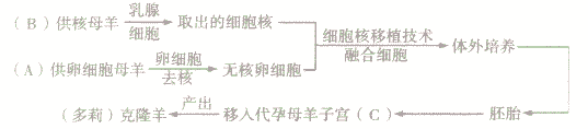 與多莉的誕生有關(guān)系的是三只母羊A、B、C。雖然多莉是由C羊生出來的,但長相卻一點(diǎn)也不像C羊,而是幾乎跟B羊一模一樣,說明指導(dǎo)個體發(fā)育的遺傳信息位于細(xì)胞核中。