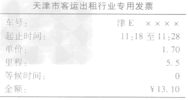 例某人乘出租車時(shí)得到一張?zhí)旖蚴锌瓦\(yùn)出租行業(yè)專用發(fā)票,如表所示,此人乘車時(shí)間為_(kāi)___;該車這段時(shí)間內(nèi)運(yùn)動(dòng)的平均速度為_(kāi)___km/h。