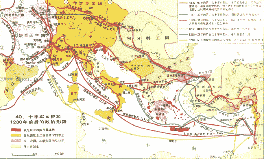 始于1095年,教皇烏爾班二世在法國南部克萊蒙召開宗教大會,以從異教徒手中奪回“圣地”耶路撤冷為口號,煽動宗教狂熱情緒,號召發(fā)動第一次十字軍東侵。1099年7月,十字軍擊敗塞爾柱突厥人,攻占耶路撤冷,建立耶路撤冷王國,以及愛德沙伯國、的黎波里伯國和安條克公國。1144年,塞爾柱突厥人占領愛德沙,法王路易七世和神圣羅馬皇帝康拉德三世因此于1147年發(fā)動第二次東侵,在小亞細亞和大馬士革附近遭到慘敗。