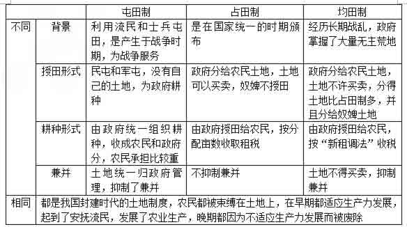 曹魏的屯田制,西晉的占田制,北魏的均田制的對(duì)比: