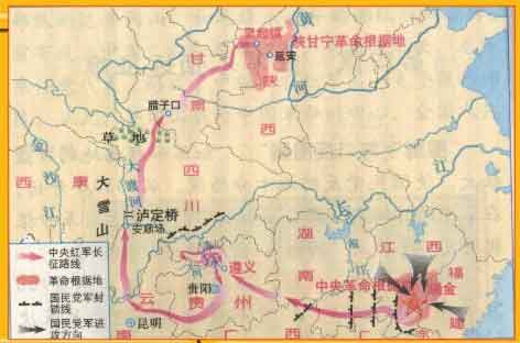 遵義會議后,鑒于川敵布防嚴密,中央紅軍確定撤離遵義后,在川黔滇邊和貴州省內迂回穿插。特別是在四渡赤水的過程中,中央紅軍靈活機動地創造戰機,運動作戰,各個殲敵,以少勝多,從而變被動為主動。隨后出敵不意,主力南渡烏江,直逼貴陽,迅即西進,4月下旬以一部在翼側策應。5月初,搶渡金沙江,擺脫了幾十萬國民黨軍的圍追堵截,取得了戰略轉移中具有決定意義的勝利。由于執行了正確的民族政策,紅軍順利通過大涼山彝族區。接著強渡大渡河,飛奪瀘定橋,翻越終年積雪的夾金山。6月中旬,與紅四方面軍在懋功會師。