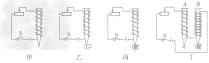 由于電磁鐵的磁性強(qiáng)弱與鐵芯的有無、電流的強(qiáng)弱、線圈的匝數(shù)多少有關(guān)。因此,在比較電磁鐵磁性強(qiáng)弱時(shí),必須同時(shí)控制某幾個(gè)變量不變來進(jìn)行比較。例為了探究電磁鐵的磁性強(qiáng)弱跟哪些因素有關(guān),小琴同學(xué)用漆包線(表面涂有絕緣漆的導(dǎo)線)在大鐵釘上繞若干匝,制成簡(jiǎn)單的電磁鐵,圖甲、乙、丙、丁為實(shí)驗(yàn)中觀察到的四種情況。