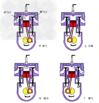 (4)排氣沖程:進(jìn)氣門關(guān)閉,排氣門打開,活塞向上運(yùn)動(dòng),把廢氣排出氣缸。(如下四個(gè)沖程的示意圖) 。