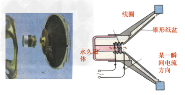 通電線圈通電產生磁性后與永久磁體發(fā)生作用,當電流方向如上圖所示時,兩者相吸,通電線圈帶動紙盆向左運動;當電流方向改變時,線圈帶動紙盆向右運動;電流的大小影響紙盆振動的幅度,于是揚聲器就發(fā)出了隨電流變化的聲音。
