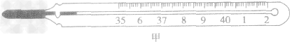 例:2008年4月,常德市出現(xiàn)了首例“手足口”病例之后,引起了市政府的高度重視,要求各地學(xué)校每天對(duì)學(xué)生進(jìn)行晨檢、晚檢、并報(bào)告檢查情況,其中就用了體溫計(jì)。圖甲是一支常見體溫計(jì)的示意圖,它的量程是____℃,它的分度值為____℃。