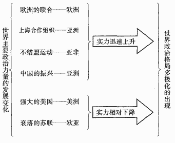 國(guó)際政治格局由兩極向多極化的演變是戰(zhàn)后世界歷史運(yùn)動(dòng)的一種基本趨勢(shì),起始于20世紀(jì)50年代后期,具體表現(xiàn)為三個(gè)并行發(fā)展的歷史進(jìn)程:資本主義陣營(yíng)由美國(guó)一家獨(dú)大演變?yōu)槊馈W、日三足鼎立;社會(huì)主義陣營(yíng)從意識(shí)形態(tài)論戰(zhàn)走向分裂;“第三世界”國(guó)家以不結(jié)盟運(yùn)動(dòng)的形式在國(guó)際政治舞臺(tái)上發(fā)揮出制衡兩極的作用。這些因素的合力推動(dòng)著多極化趨勢(shì)的發(fā)展。世界走向多極化是一個(gè)逐步演進(jìn)的過(guò)程。