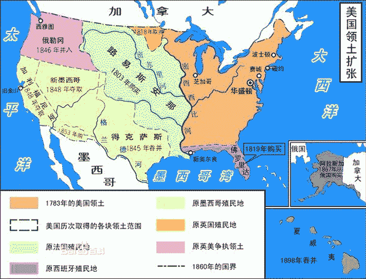 美國自1783-19世紀中葉先后通過4次領土擴張,由原有的200余萬平方公里擴展到內戰(zhàn)前的780萬平方公里,5次擴張分別是:1812年通過英美戰(zhàn)爭劃分美國的東北邊界;1810-1835年間強占西屬的佛羅里達和德克薩斯;1846年美墨戰(zhàn)爭獲得加利福尼亞地區(qū);1804年從法國購得路易斯安娜;1867年以后購得阿拉斯加并強占夏威夷。