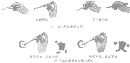 2.使用時(shí),用手捏住筆尾金屬體,將筆尖接觸進(jìn)戶線,若碰到的是火線,則氖管發(fā)光;若筆尖接觸的是零線,氖管就不會(huì)發(fā)光。(如圖乙、丙所示)