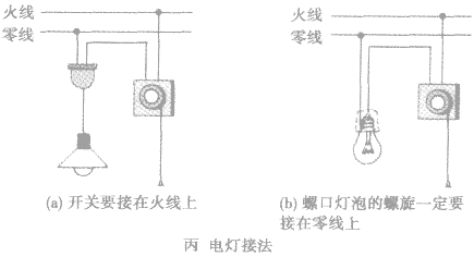 2.用電器:以電燈為例,電燈接入電路時(shí),燈座兩個(gè)接線柱一個(gè)接火線,一個(gè)接零線,控制電燈的開關(guān)一定要安裝在火線上,這樣做是為了安全。螺口燈座允許接在零線上,絕不許接在火線上。