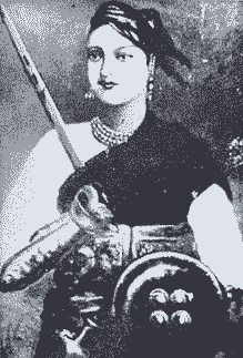 拉克西米?芭伊(1835─1858),1857?1859年印度民族大起義主要領(lǐng)袖之一。原為印度詹西邦土王甘加達爾?拉奧的王后。1857年5月印度反英大起義爆發(fā),6月率詹西軍民啊應(yīng),打敗了英軍,重登詹西王位。此后,詹西又成為起義的中心。1858年6月18日,女王率軍防守瓜廖爾城東,立馬橫刀與英軍騎兵廝殺,英勇戰(zhàn)死,時年僅23歲。表現(xiàn)了她非凡的勇氣和英雄氣概。